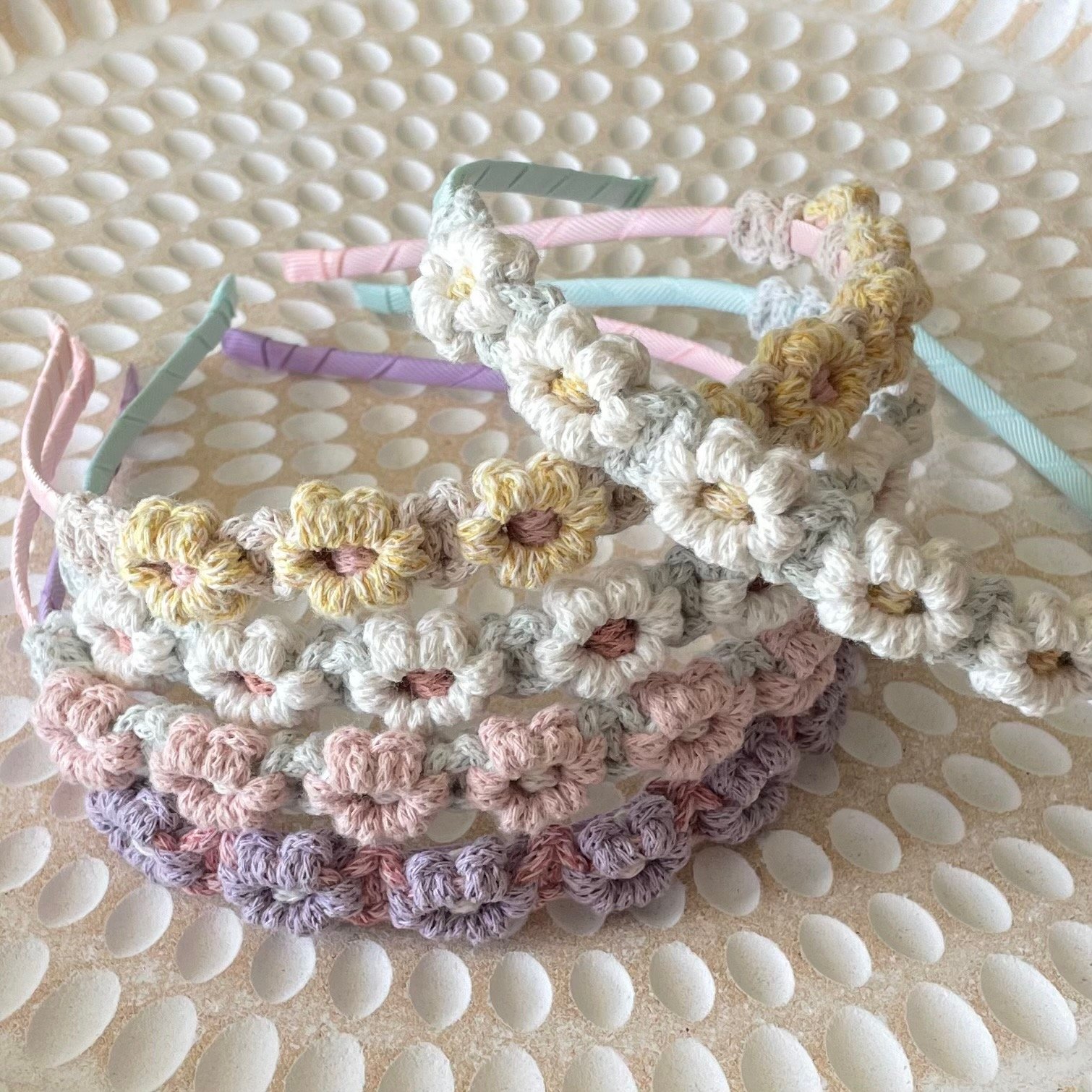 Handmade macrame daisies adorn the satin trimmed headband. Playful and colourful to pull back your hair. Simply cute!